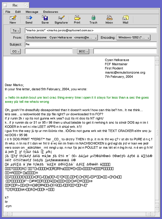 | If you're going to take the time to write to me, _please_ write in English. Or at the very least, a recognized language. | ||