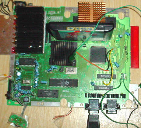 | The Megadrive, overclocked to 12MHz! Relatively stable, except during the special stages of Sonic 2 (see video). Some reds have turned into green due to a cheap capture card =P Note the _extensive_ heatsinking used -- this is *absolutely* ESSENTIAL. IT MUST BE THE HEAT. EVERYTHING needs a fan the size of belgium to even boot up. Really. | |||